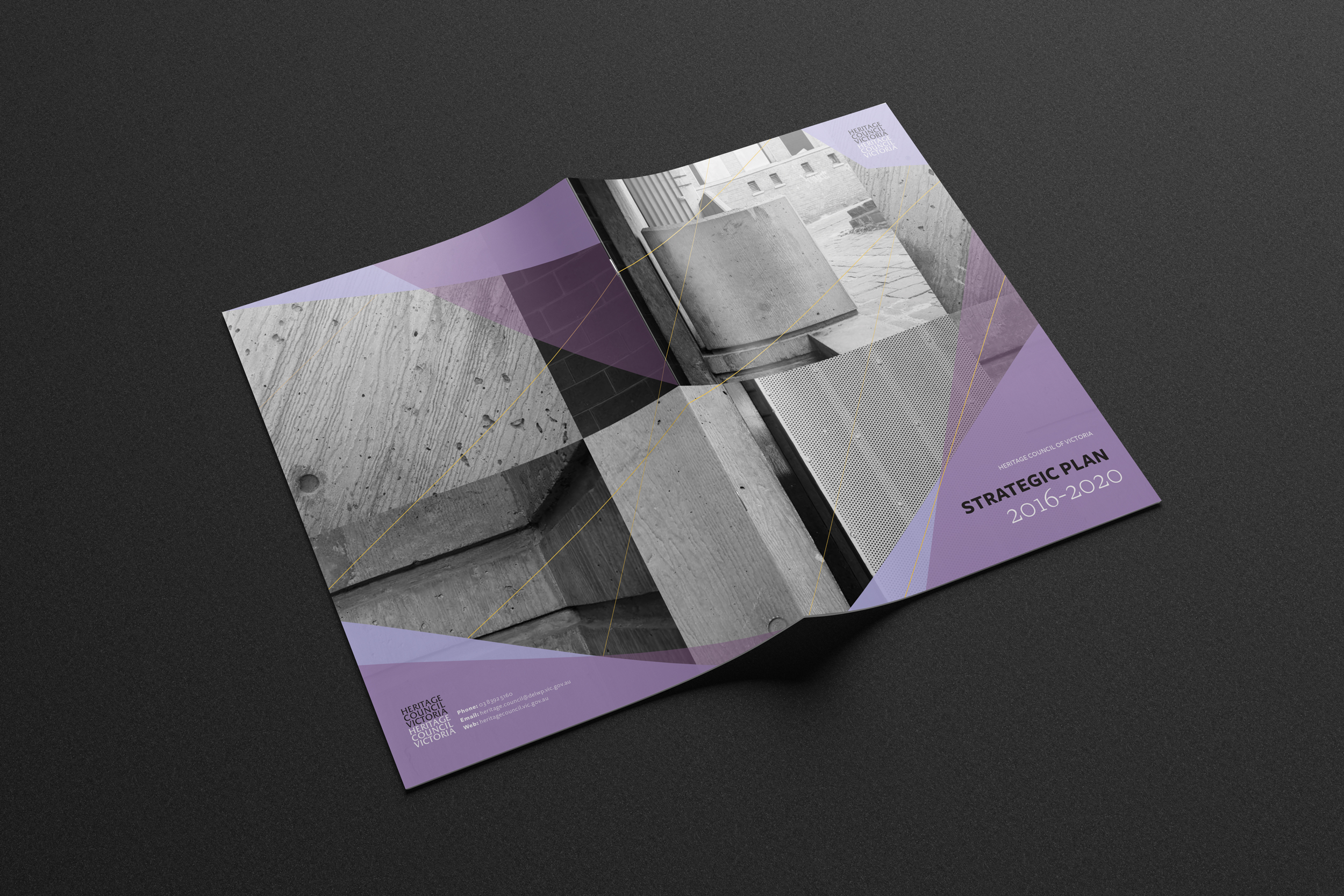 A brochure outlining The Heritage Council of Victoria’s strategic plan for the next couple of years. The brochure compliments the council’s vision for conservation in the future using a combination of dynamic angles, symmetry and combining serif and sans serif typography.